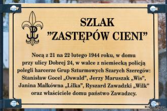 Szlak "Zast臋p贸w Cieni" powsta艂 z inicjatywy Hufca ZHP Radom-Miasto dla upami臋tnienia akcji dywersyjno-bojowych Zast臋pu Cieni Szarych Szereg贸w. W lutym 2020 r. pojawi艂y si臋 dwie tablice. Pierwsza znajduje si臋 na wiadukcie w ci膮gu ul. J. S艂owackiego, druga na ul. Szarych Szereg贸w. Po kilkuletniej przerwie zawis艂y kolejne tablice, tym razem na budynku przy ul. B艂otniej 11 i przed budynkiem przy ul. Dobrej 24.